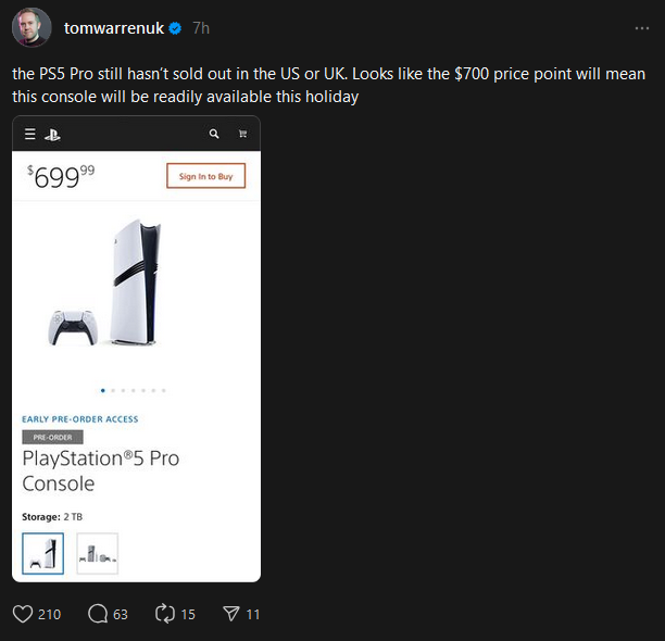 arrow-up1454arrow-down1image[Tom Warren] The PS5 Pro still hasn’t sold out in the US or UK. Looks like the $700 price point will mean this console will be readily available this holidaylemmy.world2pt_perversion@lemmy.world to Games@lemmy.worldEnglish · 1 day agomessage-square228fedilink