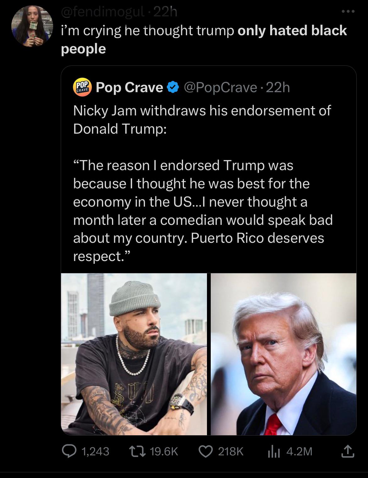 “Nicky jam is hot”. The fact that Trump didn’t even bother to know about him when thinking he was a female onstage I’m guessing would have been the first red flag for him