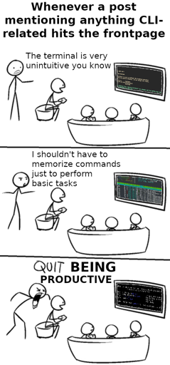 CLI evangelists try to shit on GUI constantly, as though it makes them better at computers. It doesn’t, kids