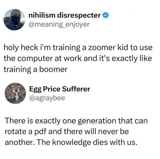 We got a new kid around 19 working at our office for processing data and I hate how true this is. The amount of times I’ve had to say “No, you have to double click to open folders” is entirely too many. Either that or “You have to actually right click on the icon you want to copy you can’t just click anywhere on the screen.”