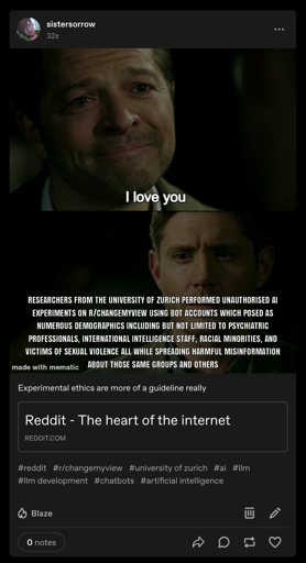 Where I stole this meme: https://www.reddit.com/r/CuratedTumblr/comments/1k8mjf4/how_the_university_of_zurichs_review_board_signed/ The meta post: https://rdx.overdevs.com/comments.html?url=https%3A%2F%2Fwww.reddit.com%2Fr%2Fchangemyview%2Fcomments%2F1k8b2hj%2Fmeta_unauthorized_experiment_on_cmv_involving%2Fmp4vgcm%2F%3Fshare_id%3DW7n2eWmaRZq3odRwfc_-5