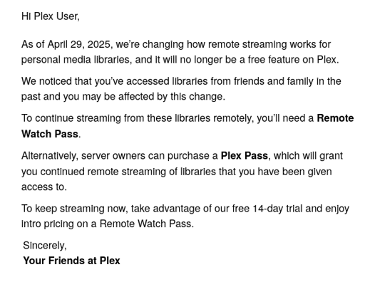 Not shitting on Plex either, gotta do what you want I think the problems with this kind of thing is the change, people had a free service for years and now they have to change or pay. People hate change, lol