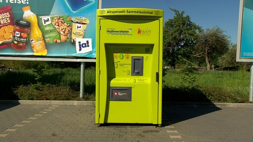 Seit knapp einem Jahr läuft in Haßmersheim (Neckar-Odenwald-Kreis) ein Pilotprojekt zum Recycling von altem Speiseöl. Auf einem Supermarktparkplatz steht ein Automat zur Öl-Abgabe.