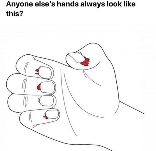 Years back I was briefly into creepypastas. One I read was a guy who had a habit of chewing his nails and that people around him always made a big deal about it but he thought they were overreacting. At the end it was revealed that he had long ago chewed away his fingernails and was now chewing through his actual fingers without realizing it. As a result he was institutionalized for his delusions, I think.