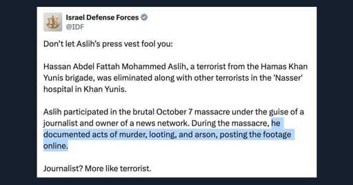 The IDF has admitted to bombing a hospital in order to assassinate a prominent Palestinian journalist in Gaza, explicitly stating that they assassinated him for engaging in journalistic activities.