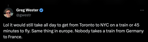 In the US people will argue it’s quicker to fly or drive than take the train then show up 2 hours early to be sure to make it through check-in and TSA security to be sure to make their flight on time. Then waste another hour waiting for luggage