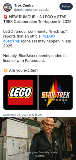 The bluebrixx models, especially the later waves, were perfect. My son recently built the USS Stargazer and it’s terrific. I can’t imagine Lego delivering the same quality considering what they shipped over the last few years. It’s a shame. Would have loved to get my hands on some more bb sets.