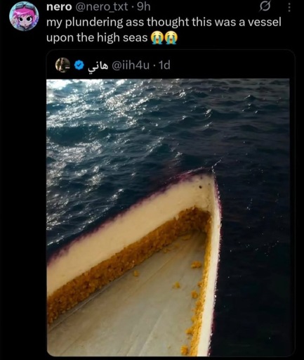 minus-squareSquirrelanna@lemmy.blahaj.zonelinkfedilinkarrow-up14·1 month agoBlueberry cheese cake lmao. The “water” is the top blueberry layer and the “boat” is where a slice was cut out.