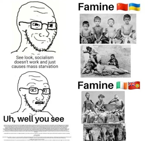 ACKTSHUALLY THO the Irish potato famine was socialism actually. Because see the British were trying to save the Irish FROM socialism, so they HAD to take all the crops. Because, ummm, if they let the Irish keep the crops that they grew, WHICH WERE FOR THE BRITISH, then that was socialism.