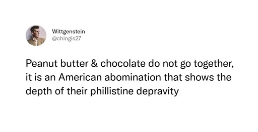 I laugh my ass off when every few years someone combines peanuts and jelly on the Great British Bake-off and literally every single time all the other British people are like “wow, you have invented literally a brand new innovative and delicious cuisine”.