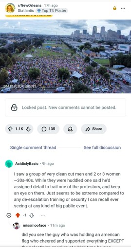 I’m not sure they were actually with any security Indivisible had trained, but maybe? They also could have been feds who just got yellow vests and were impersonating activist security, but they definitely weren’t “local activists.” I would be curious to know what kind of security people in blue states saw at their rallies/marches yesterday?