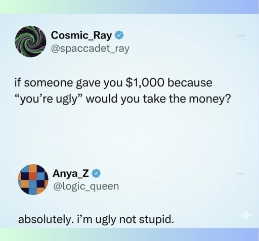ickplant@lemmy.world to Lemmy Shitpost@lemmy.world · 21 days ago$1,000 richerlemmy.worldimagemessage-square40linkfedilinkarrow-up1979arrow-down16