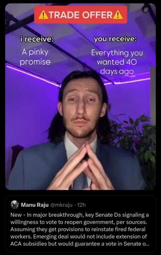 I can almost guarantee you at this point that it was either the air travel lobby, or dems being worried that Trump might actually be able to whip the votes to nuke the filibuster. Leaning more towards the filibuster at this moment.