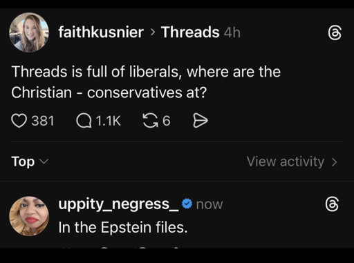 That’s literally all I see on X, but I don’t think I’ve ever seen one even mildly conservative acting or looking person on Threads. Weird. Algorithms, maaaan.