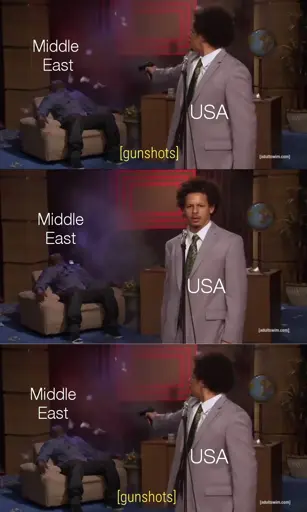 First frame shows man labelled “USA” shooting man labelled “Middle East”. Caption reads “[gunshots]”. USA is standing, while Middle East sits in a lounge chair.