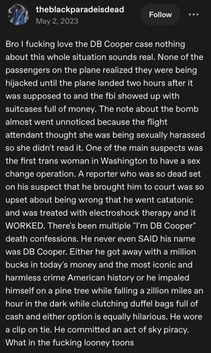 And how they also fucked up the investigation by future proofing it for him. Dan Cooper (that’s what he wrote his name as) smoked several cigarettes and kept the butts on the plane, and he had several drinks and… they just threw away the stir sticks he used and also the cigarette butts, hence foiling any attempts to get dna down the line.
