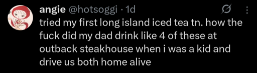 On the other hand, a Long Island iced tea from Outback Steakhouse is probably just a shot of vodka in a glass of crushed iced filled with sugary brown concentrate.