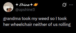 And she won’t be needing that wheelchair anytime soon with all that weed. Unless she gets the munchies and runs out of food, but let’s face it, a grandma’s house never runs out of food.