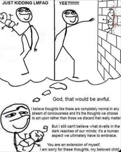 I had a thought like that and it’s so messed up I would literally be scared to share it anywhere because once it’s out there someone might actually do it and then I would feel responsible. But good to know it’s normal.