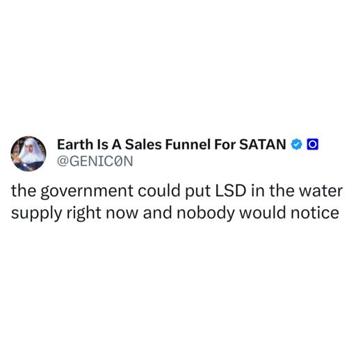 I’m like 50% certain (as someone who has not partaken in the substances which I’m about to talk out my ass regarding) that OOP must’ve simply meant something less… kosher, shall we say – PCP? Bath salts? Cocaine? Some other drug that would actually account for the insanity? As far as I know LSD is a vastly more pleasant experience than whatever the fuck is going on in the world right now, unless you’re taking really massive doses, in which case… I think things would be arguably less coherent, though you’ve absolutely got me stumped as to how the current news cycle could be more insane than it already is.