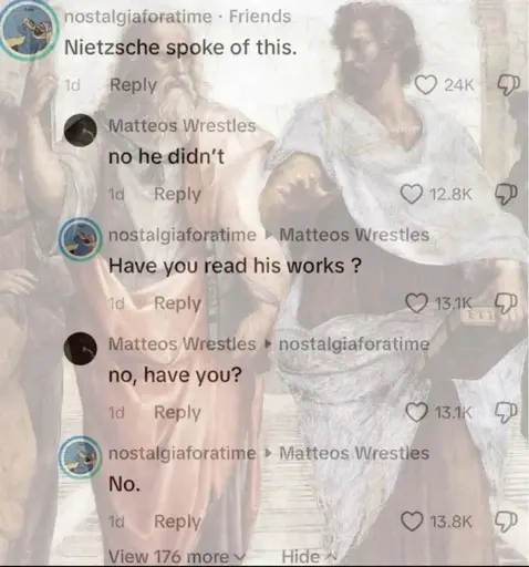 minus-squareTheTestHuman@feddit.orglinkfedilinkarrow-up4·5 days agoI read like 50 pages of Menschliche allzu Menschliches. I think this is a great reference to his imaginary friends he created for himself in lack of real ones.