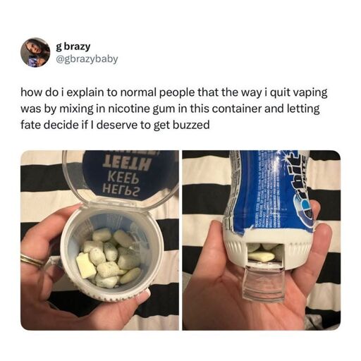 I’m not sure this works because you don’t chew nicotine gum like regular gum. I think you release the nicotine by chewing, so you munch on it a few times and then let it sit for a while.