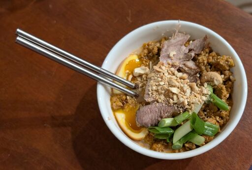 The tare was Japanese dark soy sauce, ground sesame, roasted tahini, peanut butter, leek, and homemade chili oil.