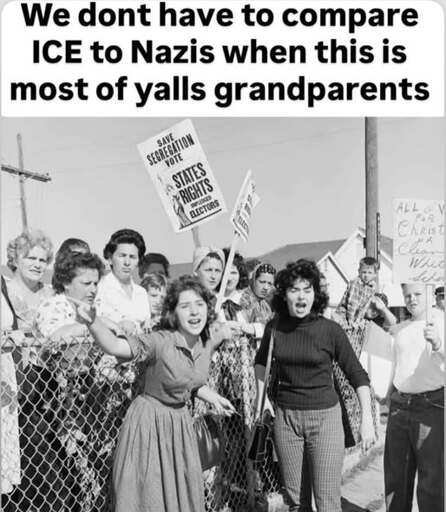 Half my grandparents were in Syria and the other half were fighting against segregation. People like Anne Braden were around and I choose to identify with her America while disowning and shaming scumbags like ICE and those pictured. There are historical Americans that can and should be absolutely shamed and there are ones that did everything in their power to improve the country for all. Neither should be forgotten or minimized for their impact.