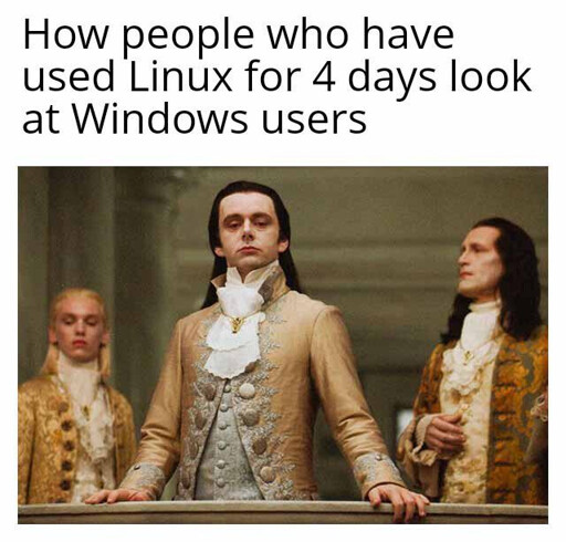ekZepp@lemmy.world to linuxmemes@lemmy.worldEnglish · 11 days agoPeasants...lemmy.worldimagemessage-square177linkfedilinkarrow-up11.63Karrow-down113