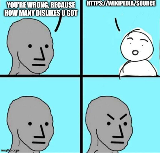 There was this one magical time where posting a source got this one user to change their mind and I don’t know if I should be happy that it worked one time or sad that it’s only worked one time. Also still got downvoted, only after the person I replied to admitted they were wrong did people start coming around but the ratio was still fucked. Something like 50 votes of them saying I was wrong to my like 5 providing a source.