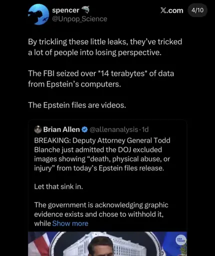arrow-up1952arrow-down1imageThe DOJ excluded images showing "death, physical abuse or injury" from Epstein files release.sh.itjust.worksspaghettiwestern@sh.itjust.works to Political Memes@lemmy.world · 4 days agomessage-square74linkfedilink