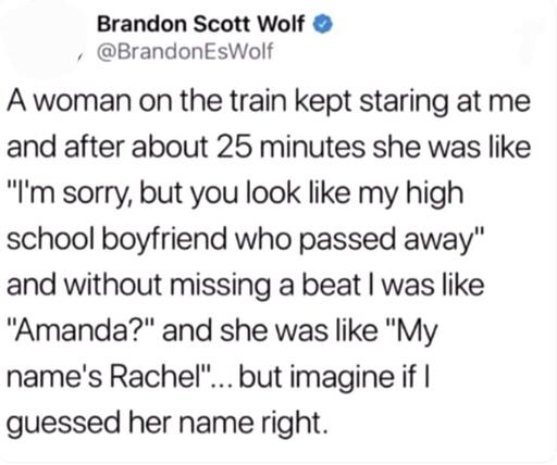 So in high school, I had to drop out my senior year. Rumors get around and I was at one of my best buddies’ birthday party. I’m talking to my ex gf and she’s really down. More than I can reasonably understand. I start prying. She eventually tells me that she used to date someone who looked like me but not also like a skeleton and he just died and talking to me was really harshing her buzz. I gave her the old Forrest Whittaker eye™ and asked her what she thought my name was.