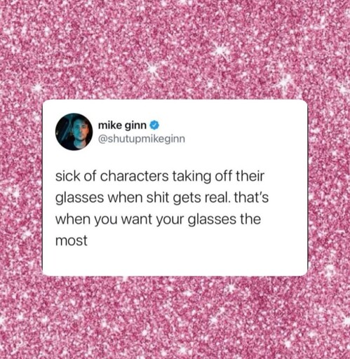 As someone who actually wears glasses, this always makes me laugh. If things are getting intense, I’m gripping mine tighter, not tossing them aside. Movie logic is undefeated.