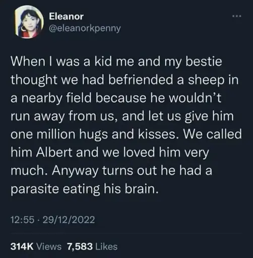minus-squareLemminary@lemmy.worldlinkfedilinkarrow-up36arrow-down1·9 days agoThat’s funny, but unless the girls are eating undercooked sheep brain, I don’t think it’d infect them. Just sharing because parasites do have specific life cycles, and people used to think that you could get infected with HIV by kissing and hugging.