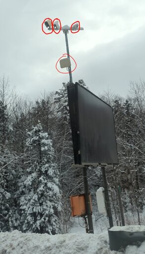 From left to right, top to bottom: 2 fixed box cameras (most likely 2 generations of ALPRs: an older (larger/yellowed: which they won’t bother removing, and instead keep for redundancy), and a newer (more capable) model), a ‘Pan Tilt Zoom (PTZ)’, and what appears to be a radar sensor (for detecting objects: possibly serving as a redundancy, during challenging weather conditions). I suspect the radar sensor got installed first (just for perimeter intrusion detection), they added the old ALPR next (to detect patterns in registered license plates); and the rest as an upgrade (including an increased field of view: through the PTZ’s movable head).