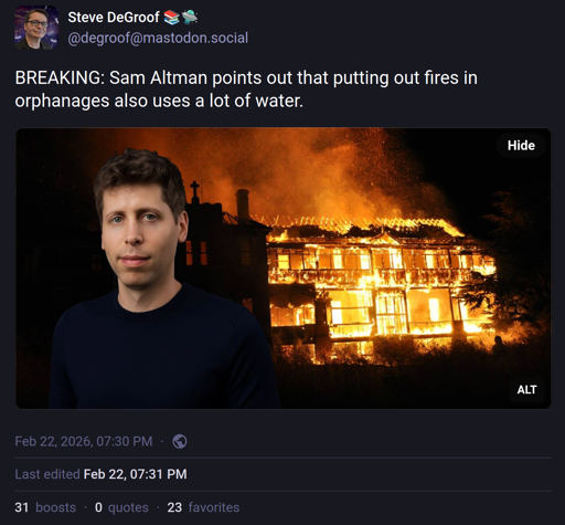 arrow-up11.19Karrow-down1imageBREAKING: Sam Altman points out that putting out fires in orphanages also uses a lot of water.media.piefed.socialSTHayden@piefed.social to Memes@sopuli.xyzEnglish · 9 days agomessage-square74linkfedilink