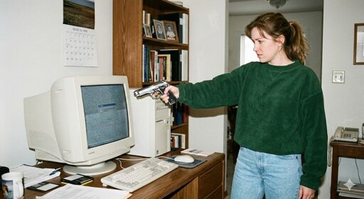 Another image of add to my “Women holding guns to computers/monitor” collection.